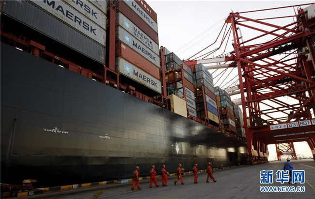 工人列隊(duì)走過(guò)一艘停泊在洋山深水港碼頭的集裝箱船(2017年9月13日攝)。新華社記者方喆攝