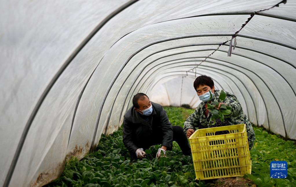 1月7日,西安市未央?yún)^(qū)西唐寨村村民陳跟娃(左)和愛(ài)人陳彩俠在自家的菜地里收菜。