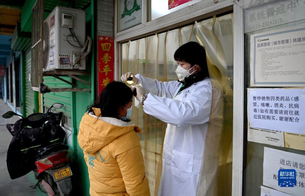 1月7日,西安市未央?yún)^(qū)西唐寨村一家藥店的負(fù)責(zé)人韓春陽(yáng)在為村民看診。疫情發(fā)生后,藥店一直沒(méi)有關(guān)門(mén),韓春陽(yáng)每天會(huì)接到六七個(gè)線上線下的咨詢,下班后還會(huì)給鄰近村子的村民送藥。