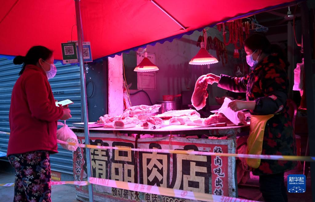 1月7日,西安市未央?yún)^(qū)西唐寨村村民在村里的肉店買(mǎi)肉。