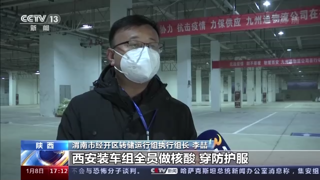 渭南市經開區(qū)轉儲運行組執(zhí)行組長 李喆:專車通道、裝卸組人員是分離的,西安這個裝車組全員做核酸、穿防護服。西安車輛過來,駕駛員不下車,全程貼封條,24小時不間斷兩班倒。