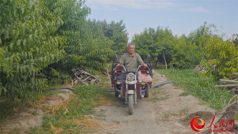 兵團(tuán)第八師一四三團(tuán)九連果農(nóng)倪澤寒在桃園里忙碌。人民網(wǎng)記者 唐宋攝